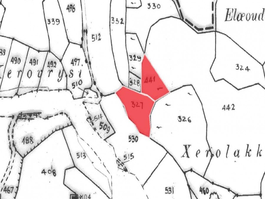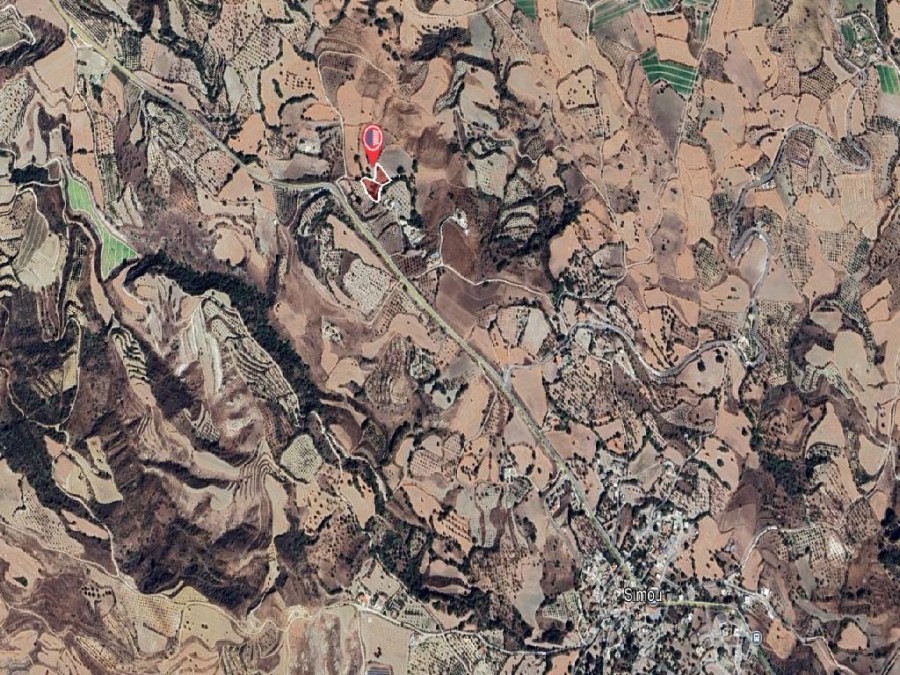 The property for sale consists of two adjacent agricultural fields in the community of Simou, in the District of Paphos. It is located approximately 1.2 kilometers northwest of the community center and approximately 1.5 kilometers southeast of the Evretou Dam.