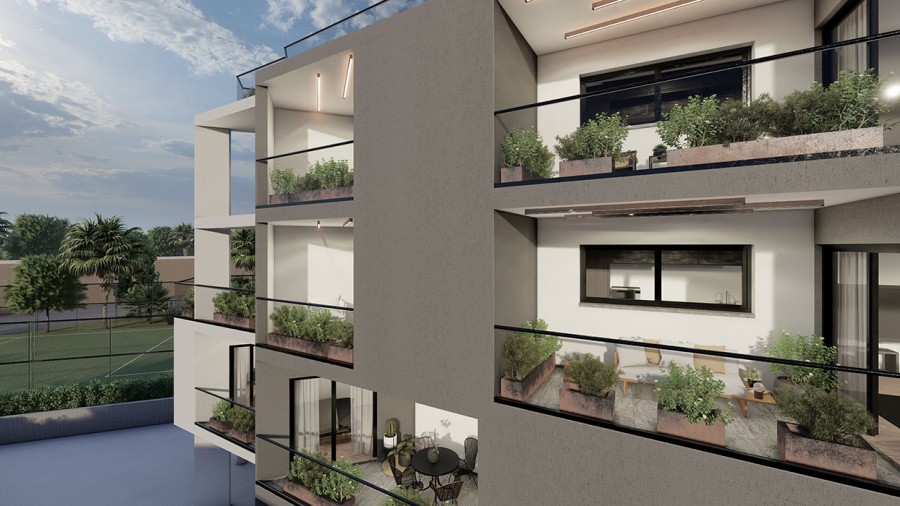 The project is a modern four-story building with two and three-bedroom apartments.