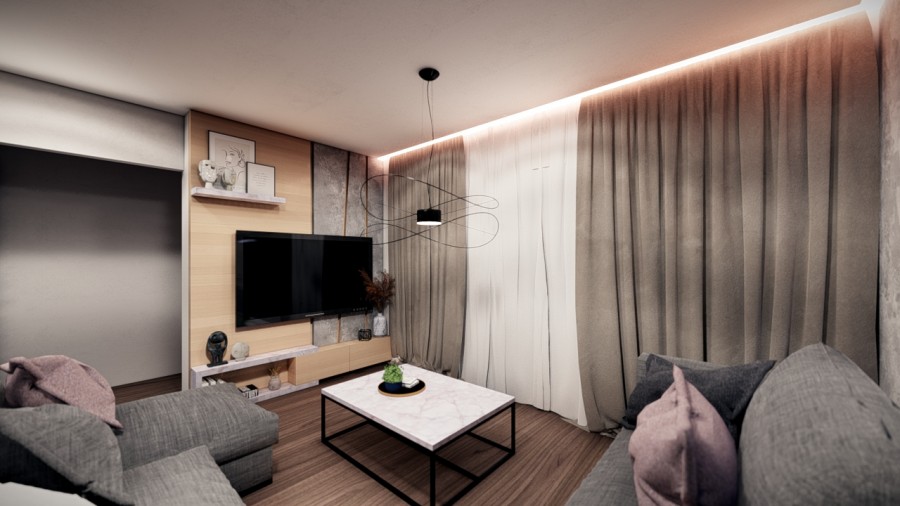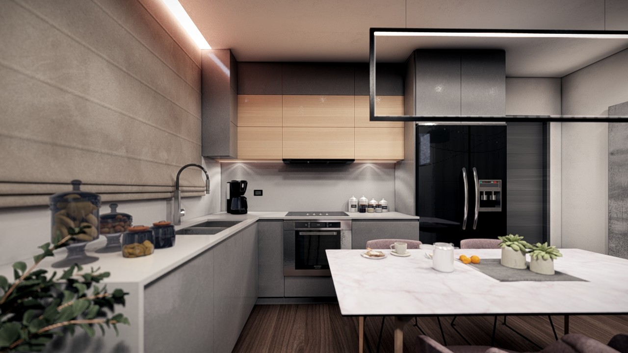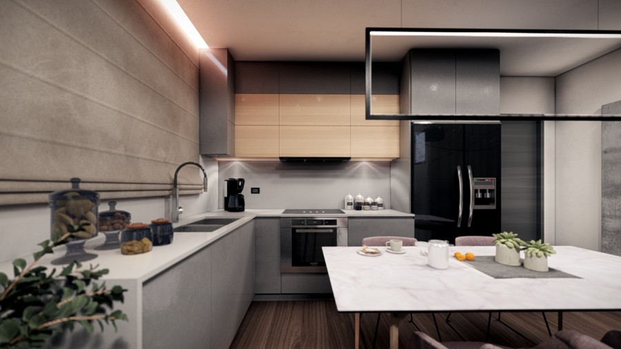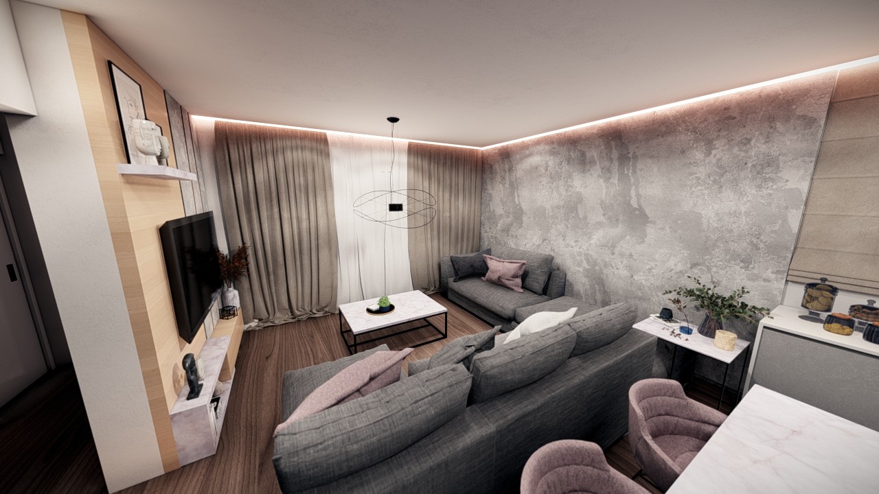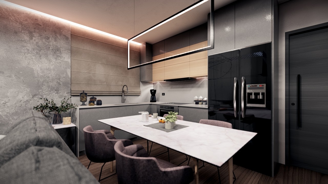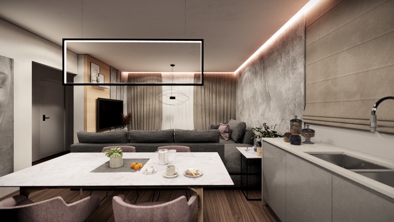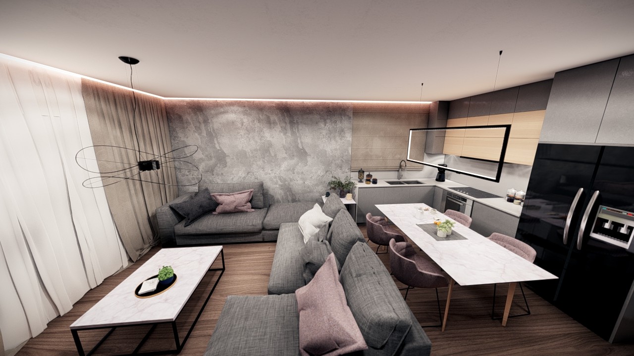 - Consists of a living room with dining area and open plan kitchen.