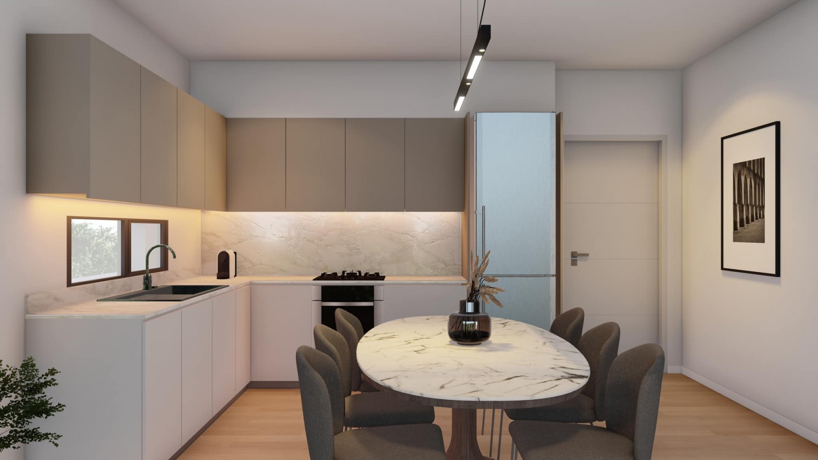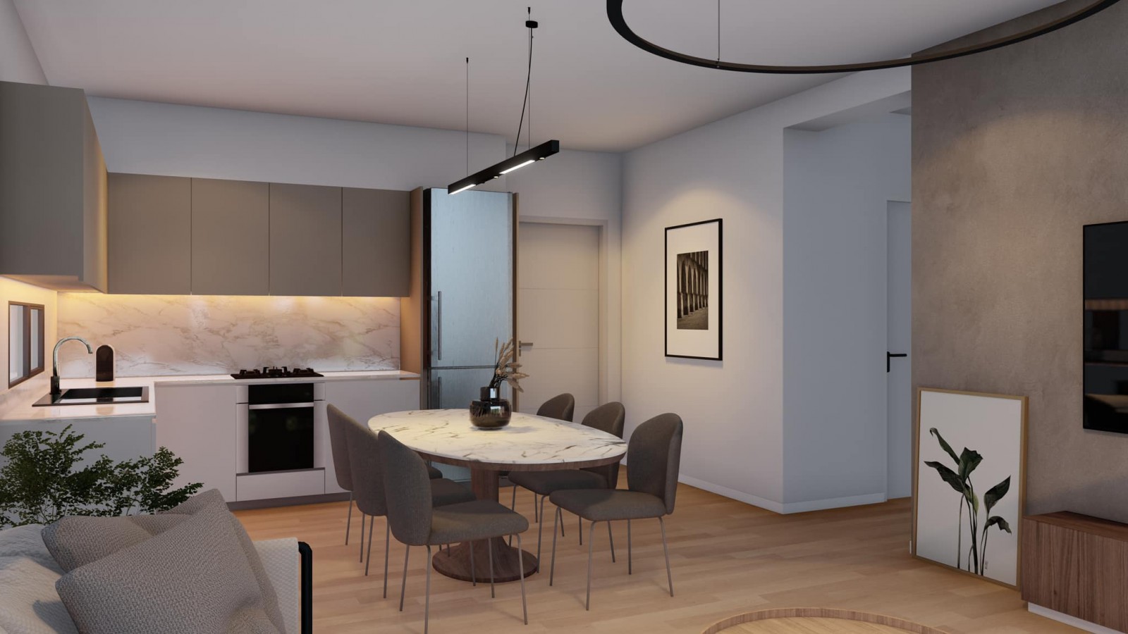 The apartment enjoys spacious and airy interiors with modern and luxurious finishes :