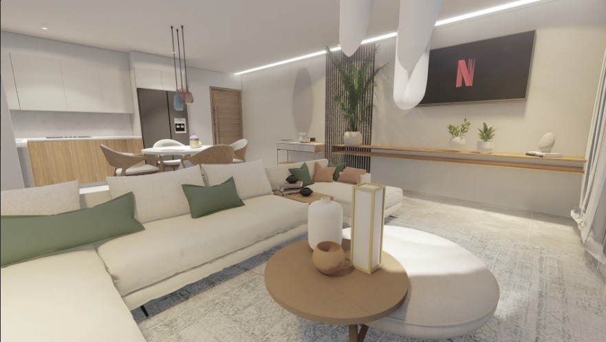 - Modern living room with dining area and open plan kitchen,